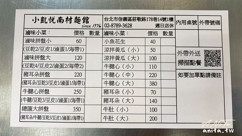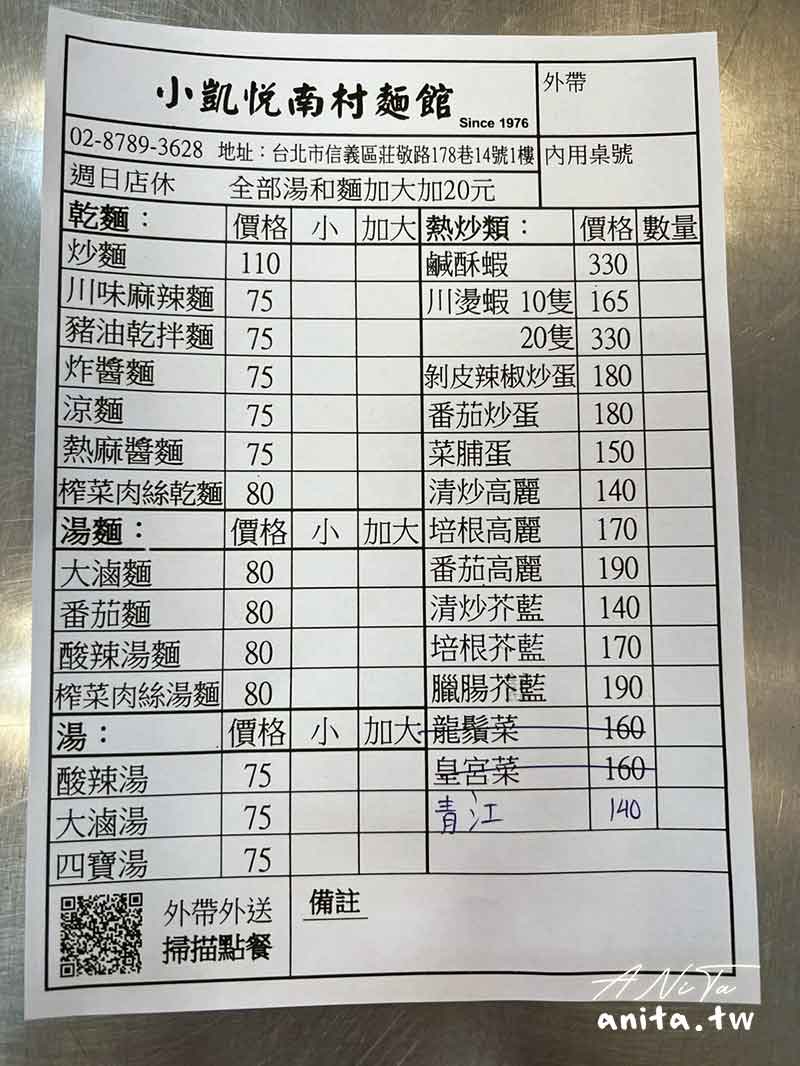 小凱悅南村小吃店的菜單有分麵食跟滷味兩種,主食只有乾麵、湯麵,另外還有熱炒跟湯類,價位在$75-330之間。