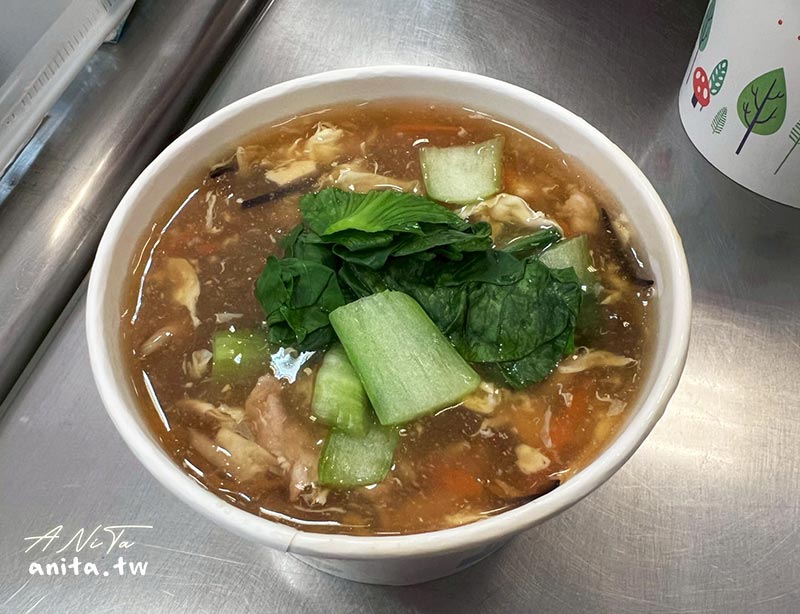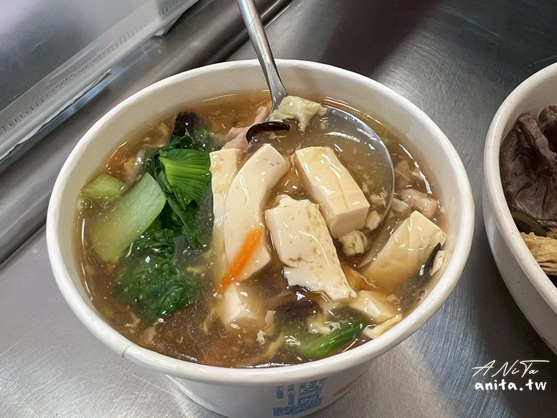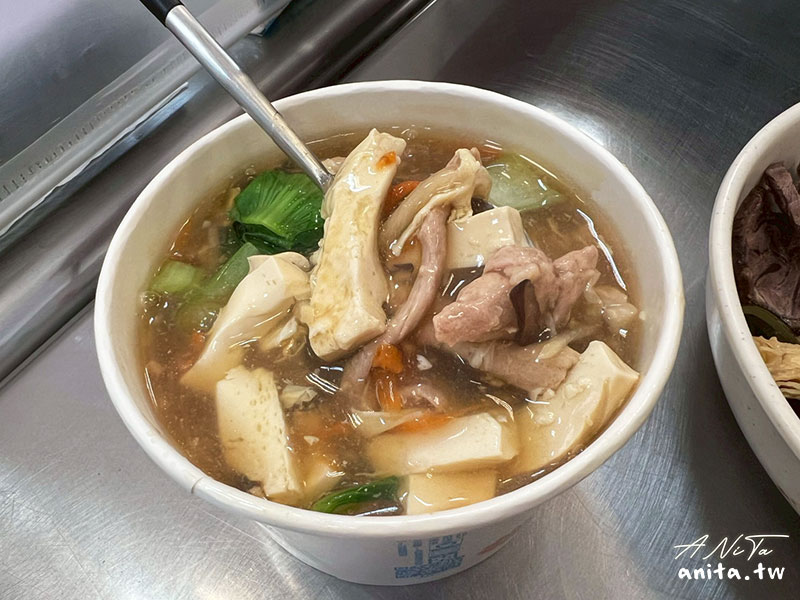 大滷湯的料給的很多,豆腐、青江菜、雞蛋、豬肉絲、胡蘿蔔絲、筍絲等,隨便撈一勺都是料,勾芡的湯頭醬油味重少了點層次,有網友說這碗大滷湯是他吃過的前三名,於是我對他的期待就拉滿,可想而知吃完就是覺得還好。