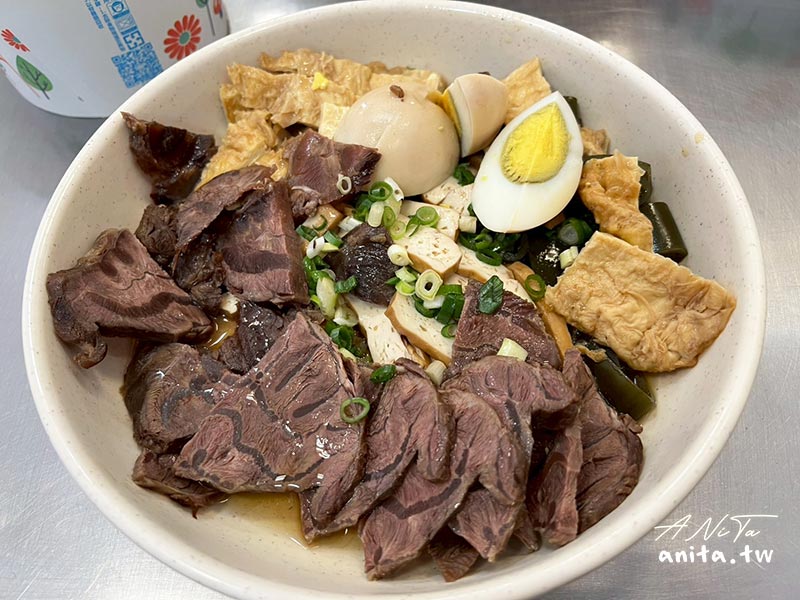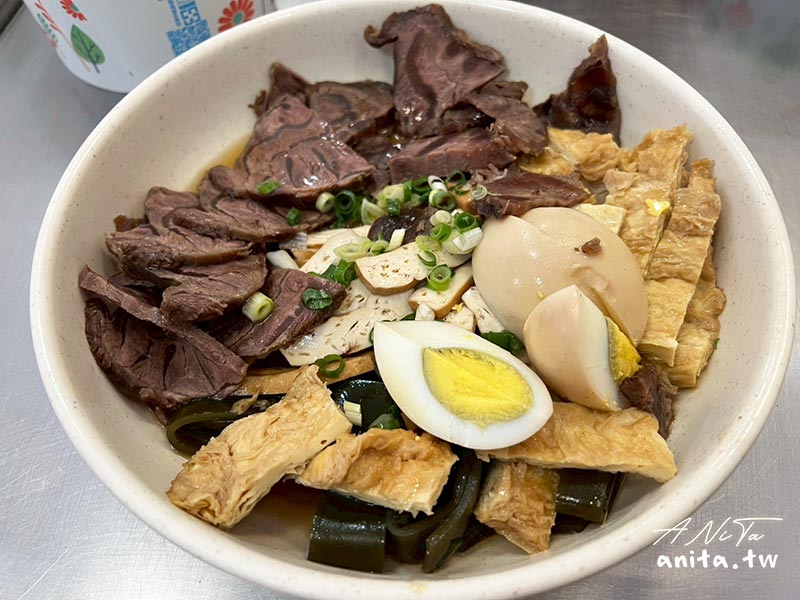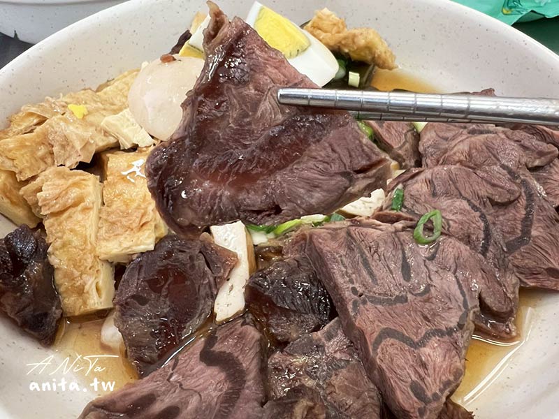 牛腱心拼盤裡面有牛腱心、豆皮、海帶、豆干、滷蛋,牛腱心沒有燉到很軟是有嚼勁的那種,有筋的地方越咬越香,食材新鮮但其實沒有滷到很入味,我們都沾辣椒吃。